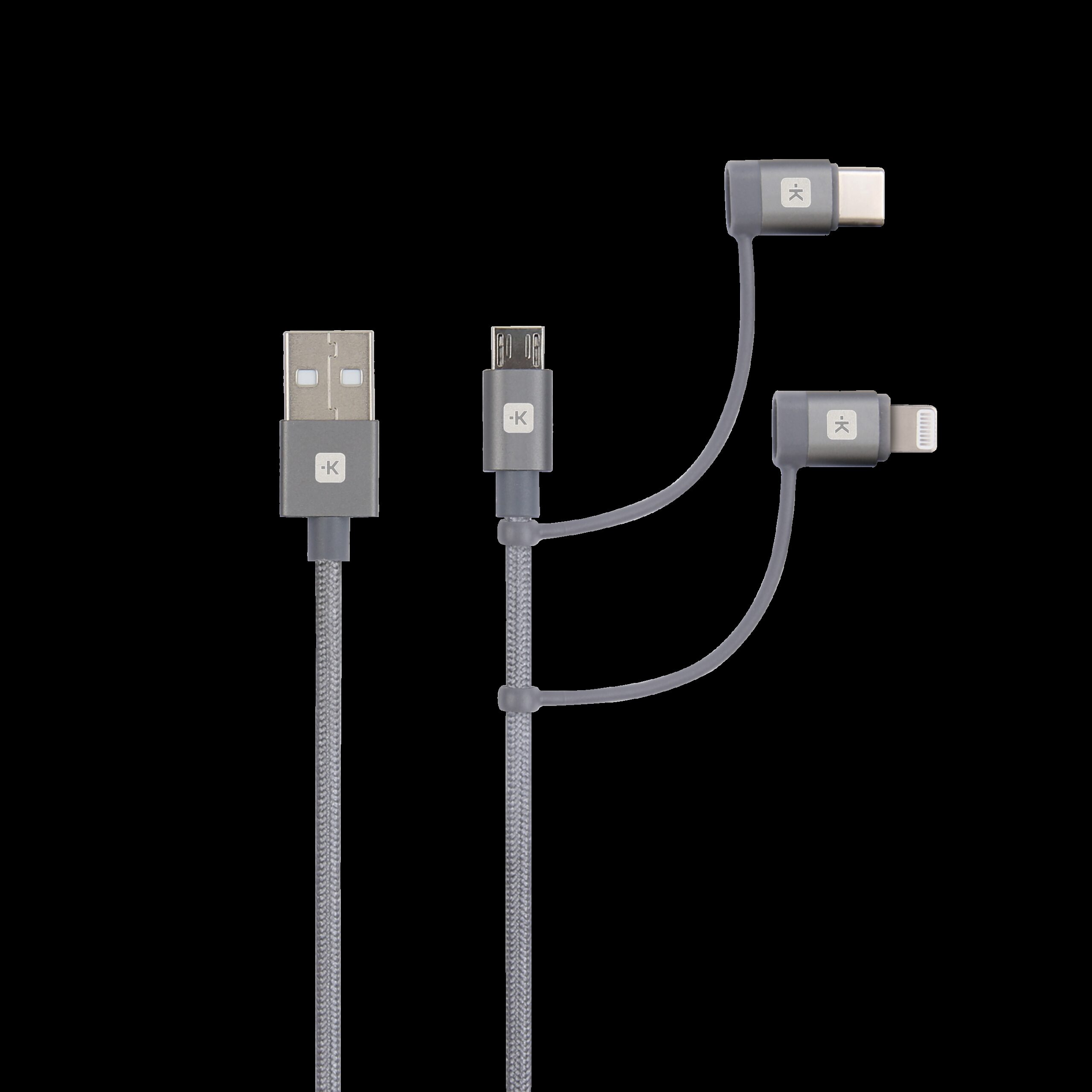 ? 3in1-kaapeli – Lightning, Typce C, Micro USB? Lataus ja synkronointi? Yhteensopiva kaikkien USB-porttia käyttävien laitteiden kanssa? Älypuhelimien ja tablettien lataamiseen? Tähtiharmaa metallinvärinen