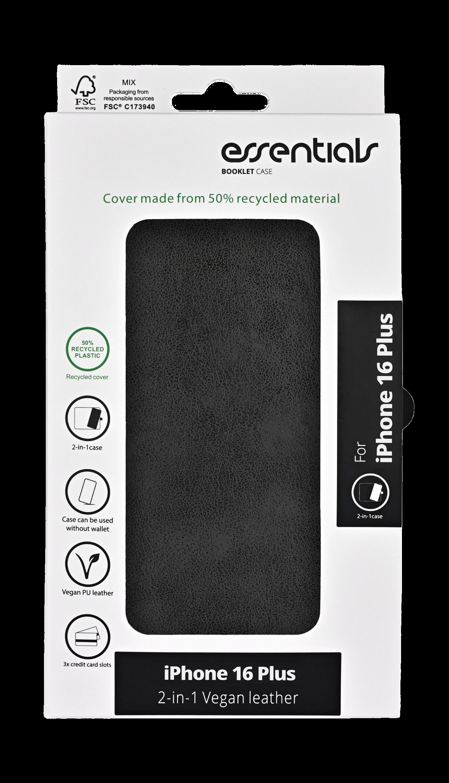 iPhone 16 Plus PU -lompakko, irrotettava, kierrätetty, 3 korttia, musta